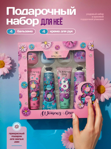 Подарок на 8 марта женщинам крем для рук увлажняющий 4шт и бальзам для губ. Подарочный набор девочке, маме, девушке, жене, подруге. Бьюти бокс уходовой косметики