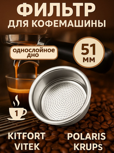 Однослойный Фильтр / Сито / Сетка 51 мм на одну порцию для рожковой кофеварки. Универсальный для Krups, Vitek, Kitfort, Polaris и других брендов.