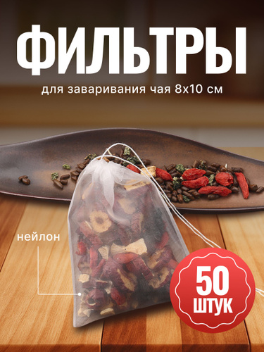 Фильтр пакеты/ пакетики для заваривания чая нейлоновые с завязками, одноразовые фильтры, прозрачные, большие 8х10, не изменяют вкус чая, 50 шт