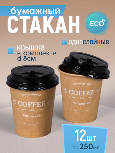 Стакан бумажный 250 мл 12 шт, Craft Line "COFFEE", с черной крышкой, одноразовый. Для кофе, чая, холодных и горячих напитков