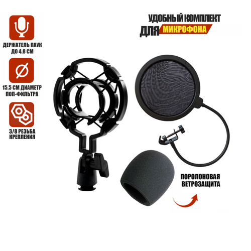 Комплект для микрофона: держатель паук P1, поп-фильтр 15,5 см и поролоновая ветрозащита