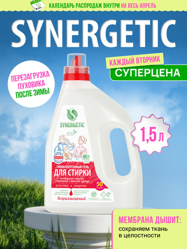 Гель для стирки спортивной одежды и мембранных тканей Synergetic ACTIVE FRESH 1,5л 50 стирок, жидкий порошок, усиленная формула, гипоаллергенный, эко