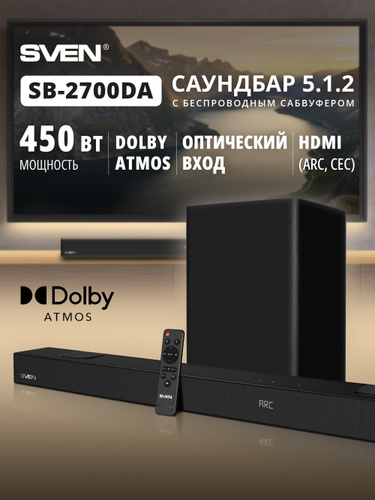 SVEN SB-2700DA Саундбар с беспроводным сабвуфером 5.1.2, Dolby ATMOS, 450 Вт, черный
