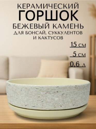Керамический горшок "Бежевый камень" для бонсай, кактусов и суккулентов, диаметр 15 см, высота 5 см