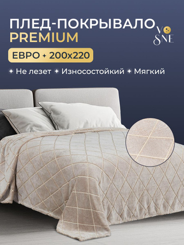 PREMIUM Плед 200х220 см евро велсофт большой однотонный мягкий плотный плюшевый. Плед на кровать пушистый бежевый Vosne