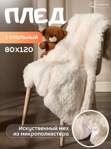 Плед пушистый на диван, на кровать 1 спальный 80х120 травка мех / молочный