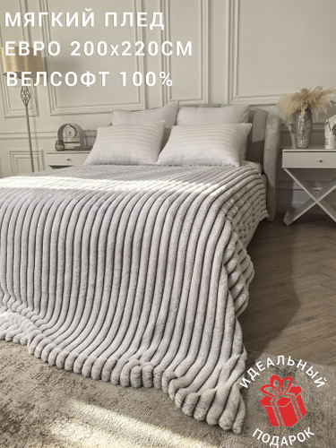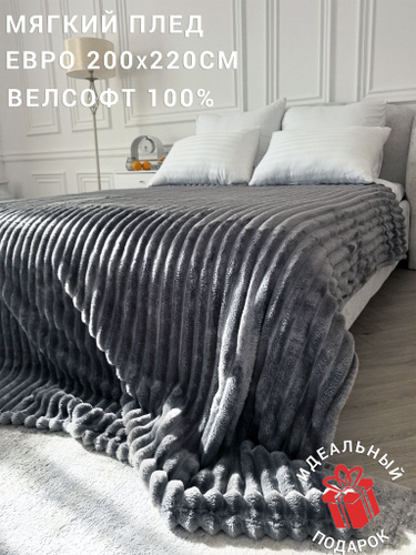 Плед 200х220, Покрывало на кровать, Серый, Велсофт, Пушистый мягкий плед на диван, кресло, Накидка