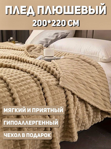Плед 200х220, Покрывало на кровать, Бежевый, Велсофт, Пушистый мягкий плед на диван, кресло, Накидка