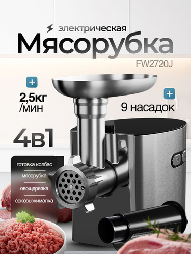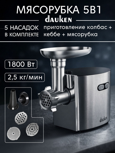 Мясорубка электрическая с насадками мощная Dauken FW2720, 1800 Вт, металлическая, 2.5 кг/мин, тихая, 3 решетки 3/5/7 мм, электромясорубка для колбас и кеббе, реверс