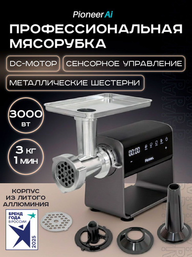 Мясорубка электрическая Pioneer MG225 профессиональная с насадками для колбасок и кеббе, мощная 3000 Вт, 6 скоростей, 3 кг/мин, реверс, сенсорное управление, LED дисплей, металлический корпус