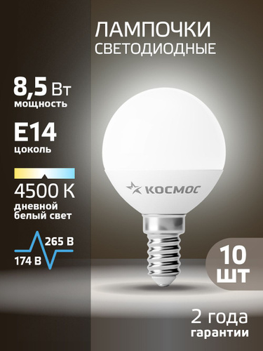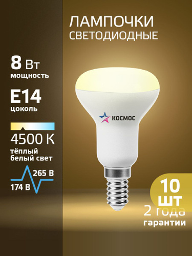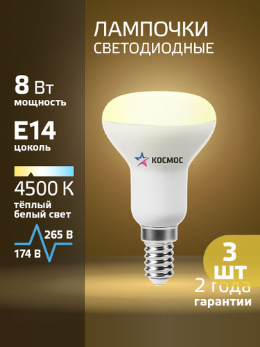 Светодиодная лампочка КОСМОС R50 8W E14 4500K, 3шт. (аналог 60Вт) холодный белый свет