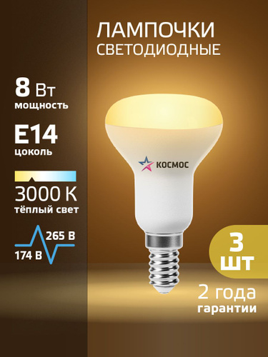 Светодиодная лампочка КОСМОС R50 8W E14 3000K, 3шт/уп. (аналог лампы R50 60W) Теплый свет