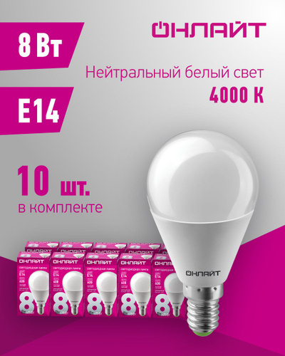 Лампа светодиодная ОНЛАЙТ 71 625, 8 Вт, шар Е14, дневной свет 4000К, упаковка 10 шт.