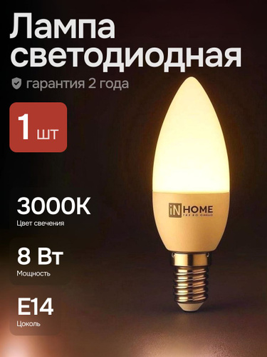 Лампочка светодиодная свеча 8Вт Е14 3000К теплый свет 1шт