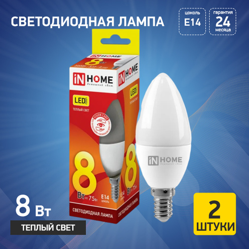 Лампочка светодиодная LED-СВЕЧА-VC 8Вт 230В Е14 3000К 760Лм IN HOME 2 штуки