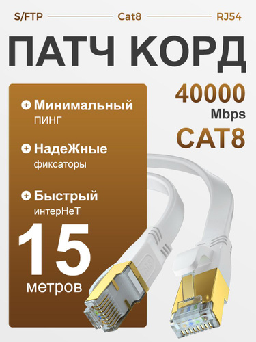 XENO Плоский Патч-корд CАТ8 15 метров Lan кабель для интернета ethernet HIGH speed 40 Гбит/с бел