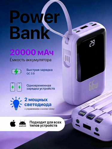 Внешний аккумулятор 20000mAh, PowerBank 20000мАч, Повербанк с кабелем в комплекте
