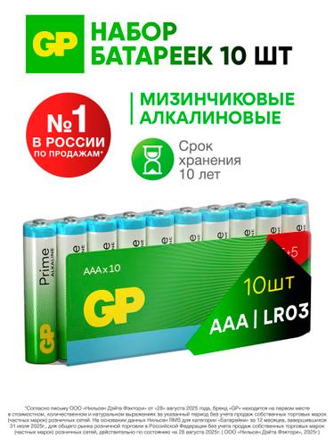 GP Батарейки мизинчиковые ААА алкалиновые, набор 10 шт