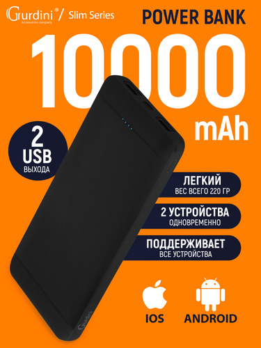 Power Bank Gurdini Slim Series 10000mAh 2 USB, черный, (ПоверБанк,Внешний аккумулятор)