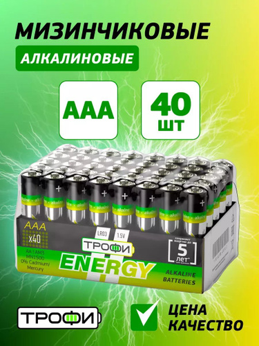 Батарейки ААА LR03 мизинчиковые алкалиновые Трофи LR03-40 bulk ENERGY Alkaline для телефона, весов, игрушек, звонка, пульта / Элементы питания 1,5 В, 1120 мАч, 40 штук