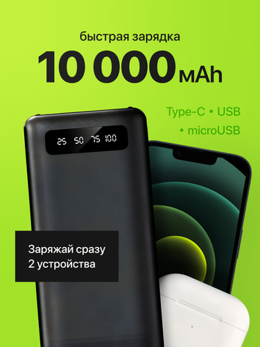 внешний портативный аккумулятор 10000 mAh, мощный повербанк с фонариком и дисплеем, зарядное устройство, powerbank быстрая зарядка для телефона