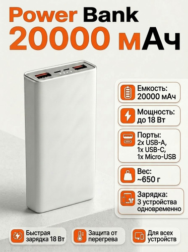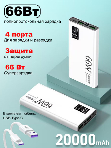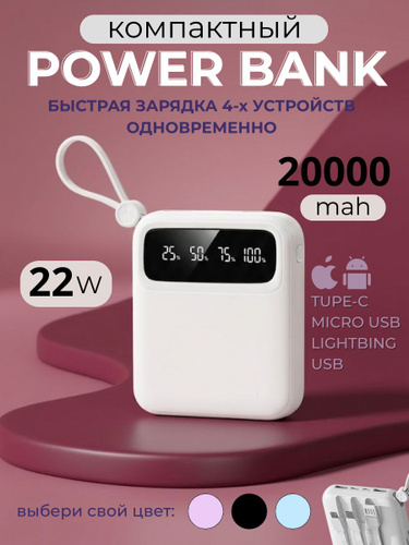 Повербанк Power bank 20000 mah с быстрой зарядкой, внешний аккумулятор с проводами