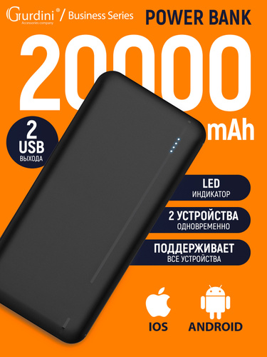Power Bank 20000mAh Gurdini Business Series 2 USB, черный, (ПоверБанк,Внешний аккумулятор)