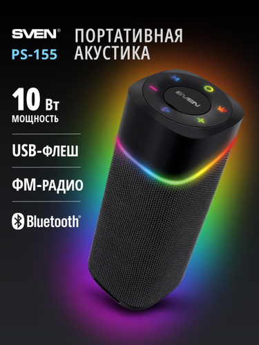 SVEN PS-155 Беспроводная портативная Bluetooth колонка / Переносная музыкальная акустика (TWS, FM - радио, RGB подсветка, USB flash), 10 Вт