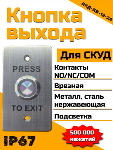 ЛКД-КВ-12-20, Кнопка выхода, врезная, металлическая, NO/NC/COM контакты, 86х50 мм