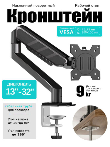 Кронштейн для монитора настольный, 13-32 дюймов, VESA 75x75/100x100, поворотный, регулируемый, до 9 кг