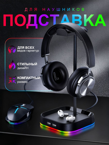 держатель для наушников,Подставка для игровых наушников с RGB подсветкой и USB портами,черное