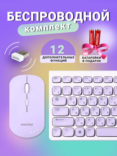 Клавиатура и мышь беспроводной набор Smartbuy ONE 250288AG, для компьютера и тв, бело-сиреневый