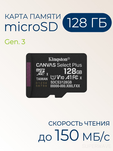 Карта памяти microSD 128 ГБ Kingston Canvas Select Plus Gen.3 Class 10 (SDCS3/128GBSP) UHS-I U1 V10 A1 до 150 Мб/с, без адаптера