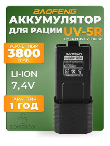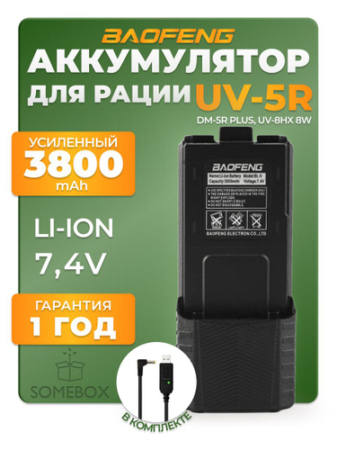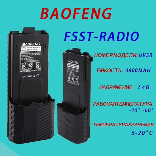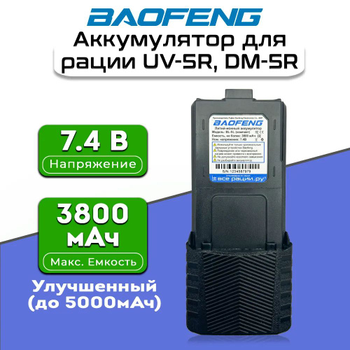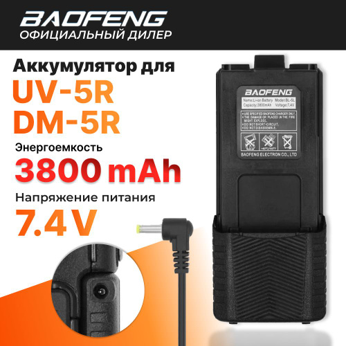 Усиленный аккумулятор для раций Baofeng UV-5R, DM-5R, UV-5X3, BF-F8HP с разъемом для зарядки (7,4V 3800 mАч) повышенной емкости - Черный