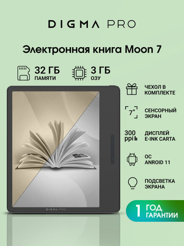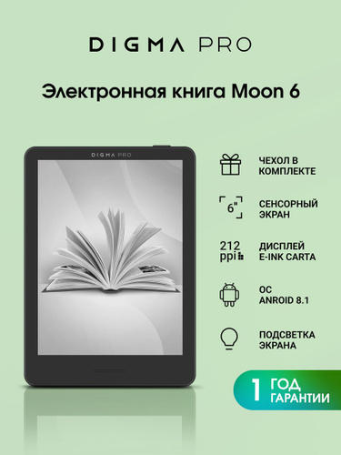 Электронная книга с чехлом Digma Pro Moon 6, E-Ink Carta 6", встроенная память 32 Gb, тачскрин, подсветка экрана, ОС Android 8