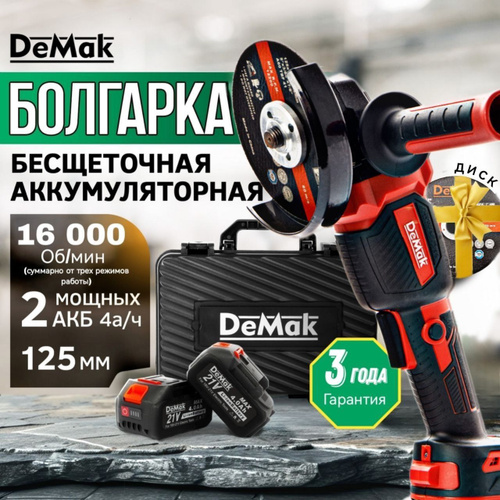 Болгарка аккумуляторная бесщеточная DeMak 21В в кейсе углошлифовальная машина, шлифмашина, плиткорез электрический ДеМак