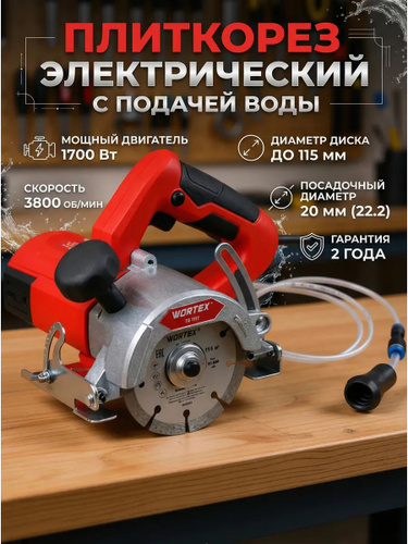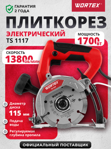 Плиткорез электрический WORTEX TS 1117 1700 Вт, 115х22.2 мм, до 34 мм (13800 об/мин, сухой и мокрый рез, 3.4 кг) (1319428)