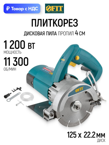 FIT Пила дисковая по бетону плитке камню циркулярная, плиткорез камнерез 1200 Вт 11300 об/мин диск 125 х 22,2 мм пропил 40 мм водяное охлаждение защита от тока УЗО