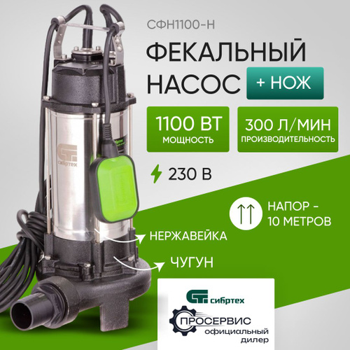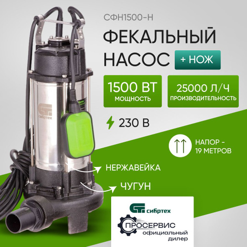 Насос фекальный погружной Сибртех СФН1500-Н 99805, 1500 Вт, напор 19 м, 25000 л/ч, с измельчителем для полива, откачки грязной воды из затопленных помещений выгребных ям канализации туалета септика