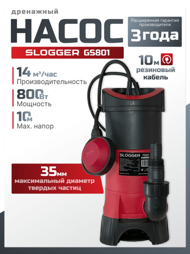 Насос дренажный для грязной воды погружной Slogger GS801, 800Вт, 233л/мин для откачки воды с песком, илом, глиной, мелким мусором