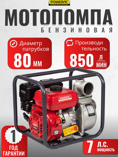 Мотопомпа бензиновая / поверхностный насос PRWP30 (80мм, 7л.с, 850 л/мин) Powerac