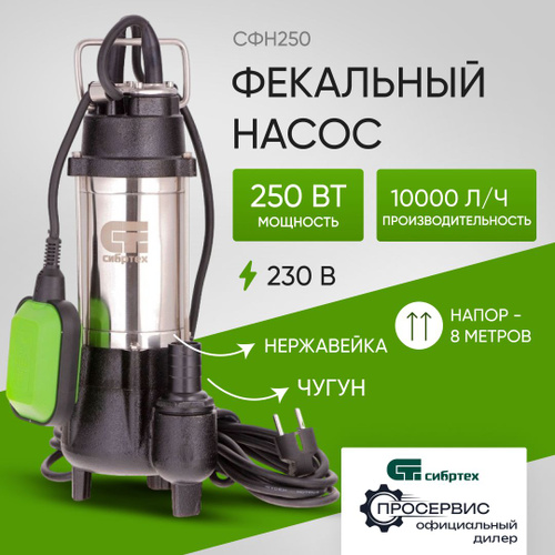 Насос фекальный погружной Сибртех СФН250 99801, 250 Вт, напор 8 м, 10000 л/ч для полива, откачки грязной воды из затопленных помещений выгребных ям канализации туалета септика