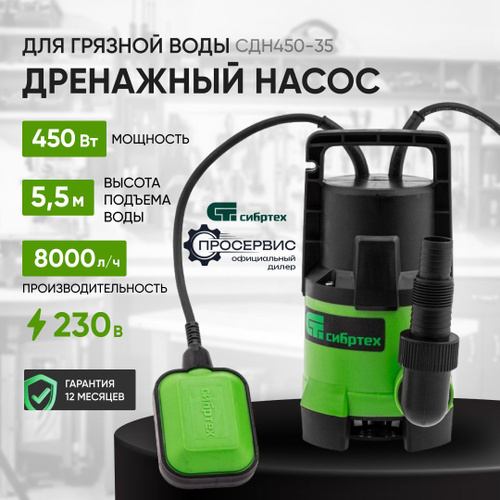 Дренажный насос погружной для грязной воды Сибртех СДН450-35 97263, 450 Вт, напор 5,5м, 8000 л/ч, для перекачки откачки бытовых и сточных воды из подвала, канализации, септика