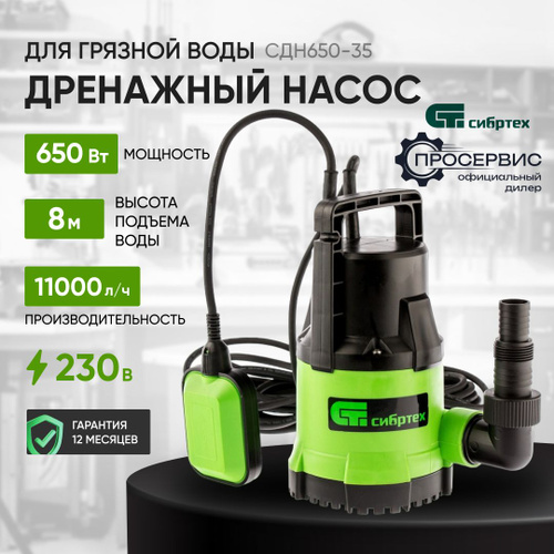 Дренажный насос погружной для грязной воды Сибртех СДН650-35 97264, 650 Вт, напор 8м, 11000 л/ч, для перекачки откачки бытовых и сточных воды из подвала, канализации, септика