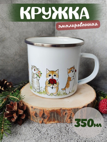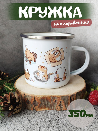 Кружка с серебристым ободком "Кот в коробке" 350мл металлическая, эмалированная походная, подарочная