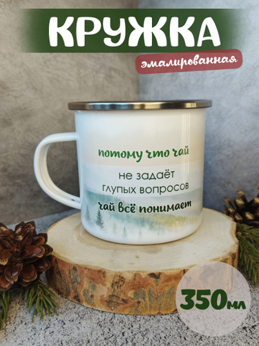 Кружка с серебристым ободком "Чай всё понимает" 350мл металлическая, эмалированная походная, подарочная