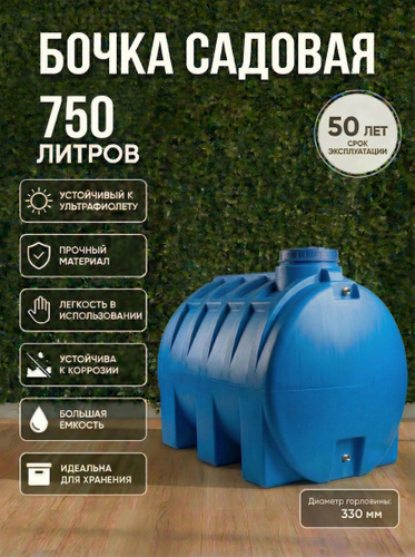 Бочка садовая 750л, бак для воды, горизонтальный, пищевой пластик