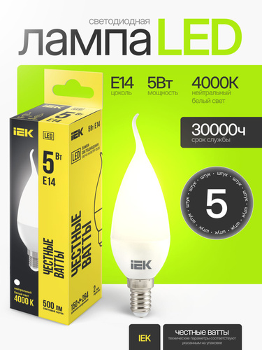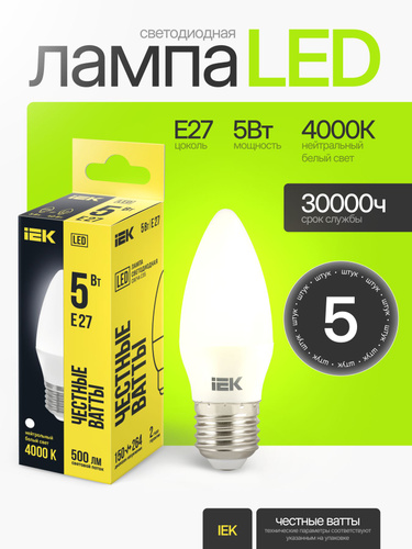 Светодиодная лампа IEK ECO 5W эквивалент 40W 4000K 450Лм Е27 свеча