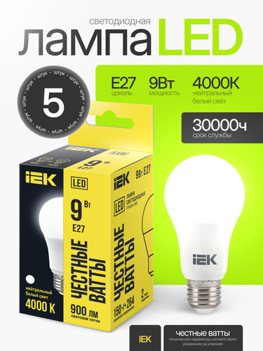 Лампочка Е27 9Вт 4000К нейтральный дневной свет светодиодная энергосберегающая LED цоколь E27 груша (комплект 5 шт)