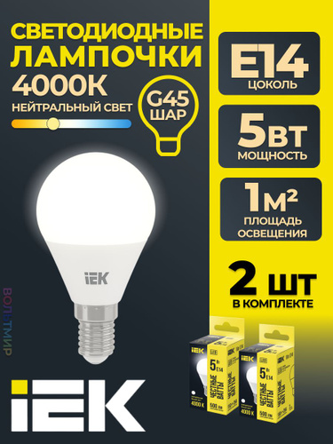Светодиодная лампа IEK ECO 5W эквивалент 40W 3000K 450Лм Е27 шар (комплект из 2 шт)